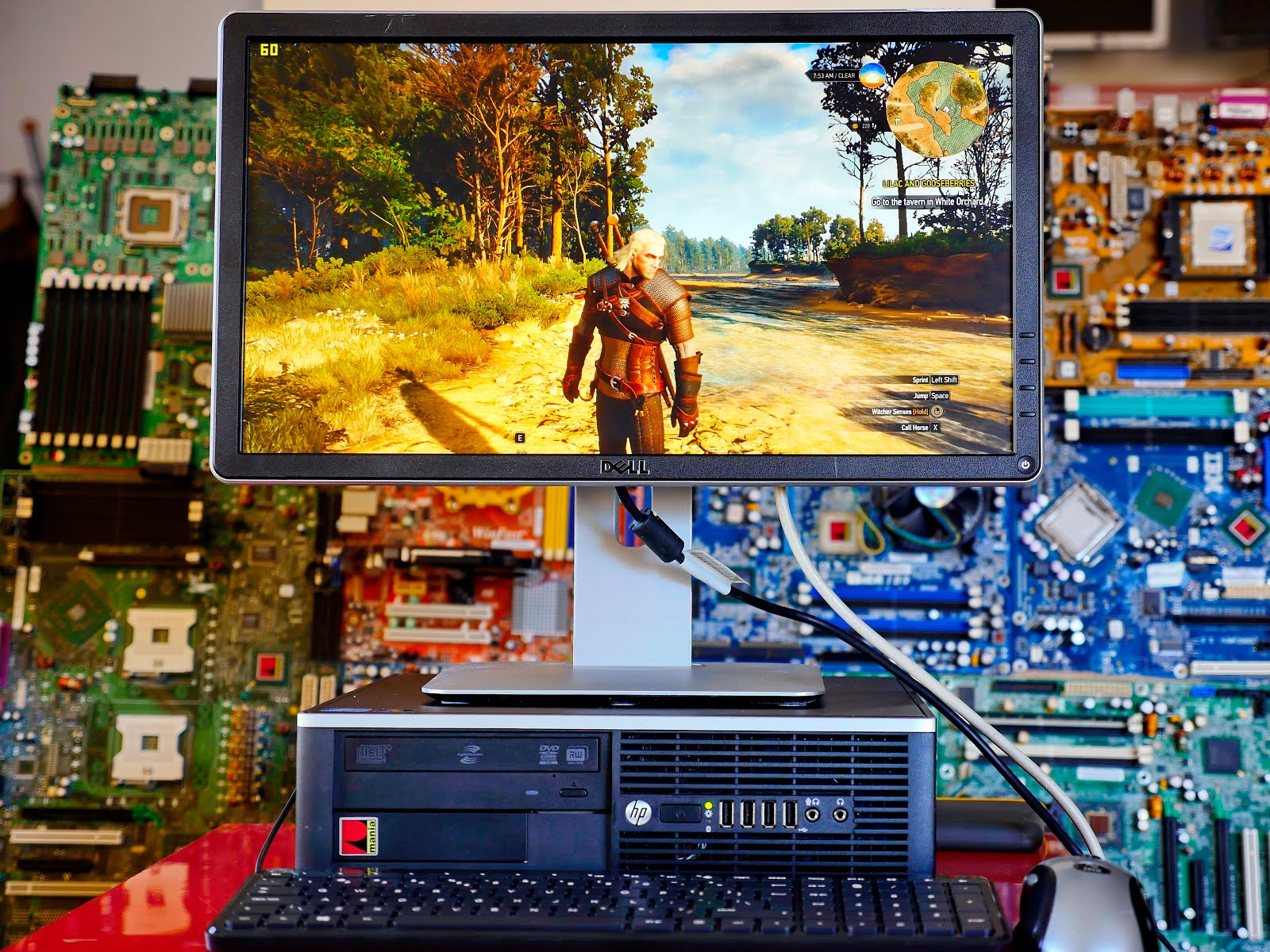 Lenovo ThinkCentre M70e с Intel Core 2 Duo E8400 на 3.00GHz. Отлично се справи с Witcher 3, 40fps на високи настройки.